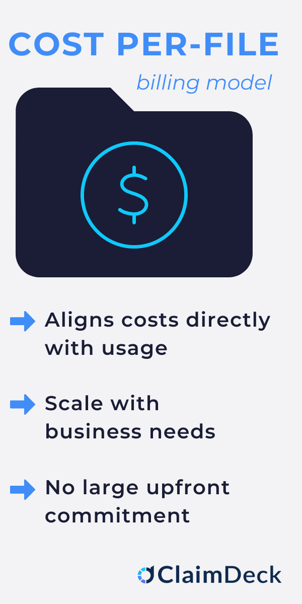 The per-file billing model also allows the carrier to allocate the cost of ClaimDeck to each individual file, benefiting the carrier's internal cost allocation for tighter accounting treatment.
